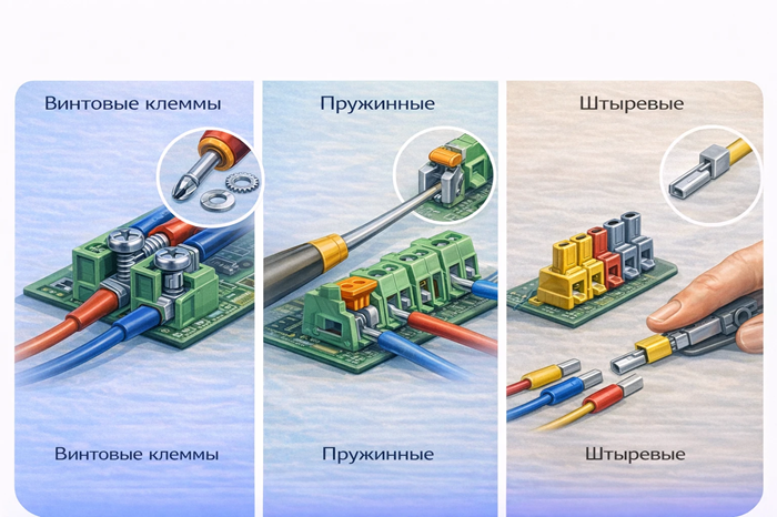 Пружинные клеммы используют пружинящий элемент для фиксации проводника. Такой тип соединения находит все большее распространение, особенно в условиях ограничения пространства и массовых монтажах.